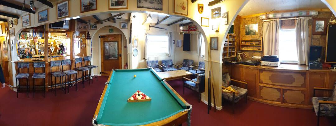Die Tischler steckten ihre Seele in den Bau der Kneipe der «Faraday-Station». Der Innenraum ist mit rustikalen Holzbalken und alten Gemälden berühmter Antarktisforscher über den Sitzen dekoriert. Eine Dartscheibe hängt an der Wand. Es gibt einen Billardtisch, Schneeschuhe hängen über der Bar.