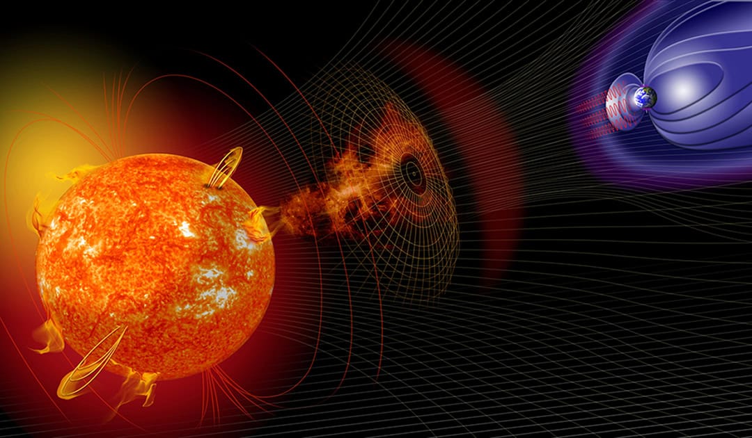 Aber wie können die Spuren eines vergangenen Sonnensturms in die Stämme der Bäume gelangen? Wenn es zu Sonneneruptionen kommt, setzt die Sonne starke magnetisierte Wolken aus geladenen Teilchen (Plasma) frei. Wenn diese Wolken auf das geomagnetische Feld der Erde treffen, kommt es zu geomagnetischen Stürmen. Das geomagnetische Feld lenkt dann die Teilchen des Sonnensturms in die Atmosphäre, insbesondere in die Polarregionen. Dieses Phänomen erzeugt die nördlichen und südlichen Polarlichter.