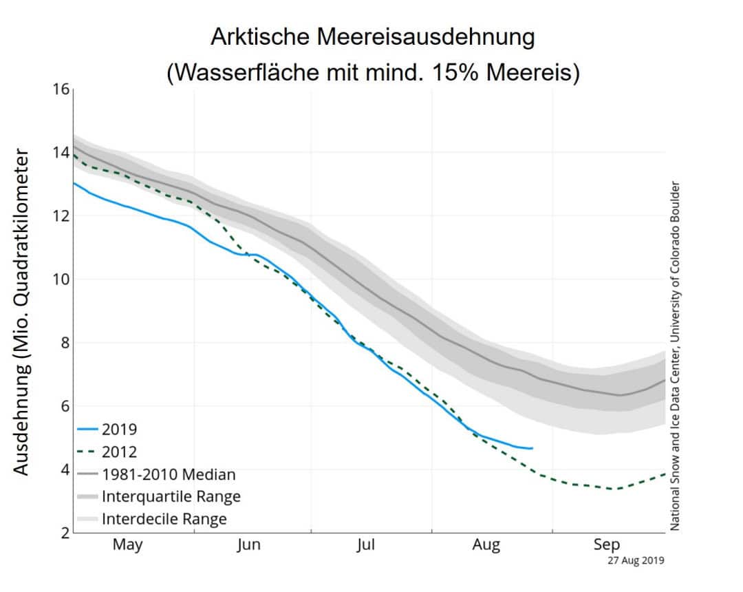 Seit Monaten ist klar, dass der Sommer 2019 für das arktische Meereis kein guter Jahrgang ist. Wahrscheinlich ist, dass sich seine Ausdehnung in der Grössenordnung des Negativrekords von 2012 bewegt. Auch im Bereich der Nordostpassage ist das Eis enorm stark zurückgegangen und hat Russlands nordische Lebenslinie jetzt komplett offen gelassen. Zusätzlich haben russische Forscher im Bereich des Archipels von Novaya Zemlya 5 neue Inseln entdeckt, die grösste davon rund 55 Quadratkilometer gross.
