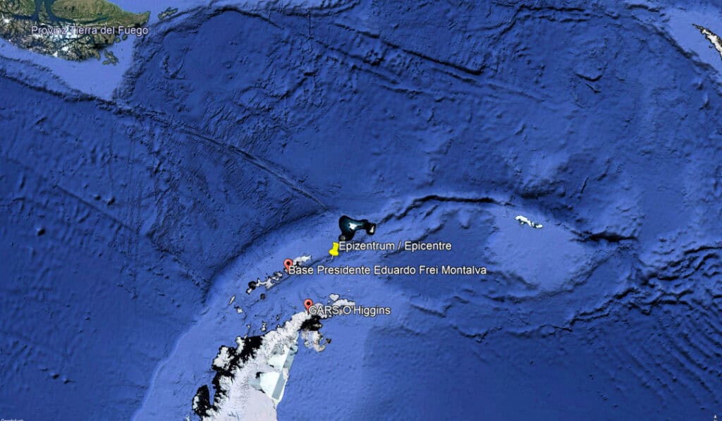 Ein Erdbeben der Stärke 7,0 auf der Richterskala hat die Spitze der antarktischen Halbinsel erschüttert. Wie die chilenischen Behörden mitteilen, wurde das Beben um 23.36 GMT in einer Tiefe von 10 Kilometer registriert. Die Region des Erdbebens liegt an der Nordspitze der antarktischen Halbinsel, rund 210 Kilometer östlich der chilenischen Station Presidente Eduardo Frei de Montalva und nördlich der zweiten chilenischen Station Bernardo O’Higgins.