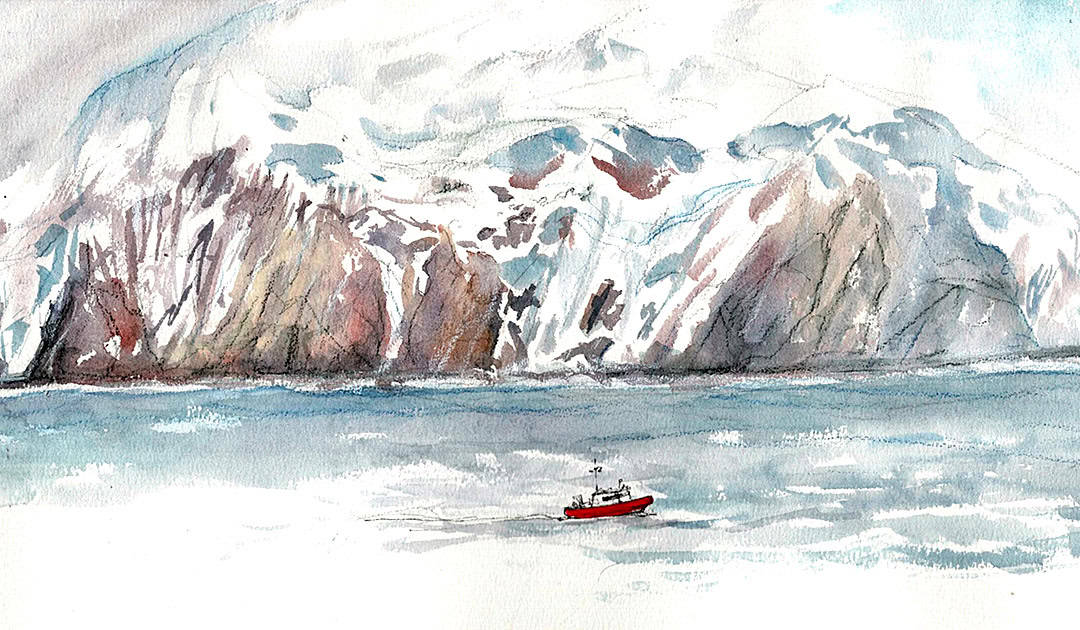 Au cours d'un voyage de cinq semaines en Antarctique à bord d'un navire de la Royal Navy, Claudia Myatt a dessiné les îles, le paysage et la faune, les immortalisant dans ses croquis.