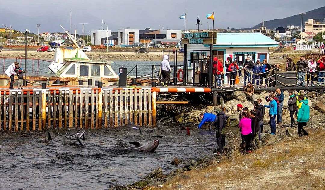 Last Sunday at noon, visitors to the Ushuaia Yacht Club witnessed an unusual event. More than a dozen dolphins approached the shore at full speed and beached themselves next to the pier. The news was spread through a video that began circulating on Twitter. In the sequence, a group of false killer whales, as these animals are also called, can be seen panicking very close to the shore between ships and pleasure boats.