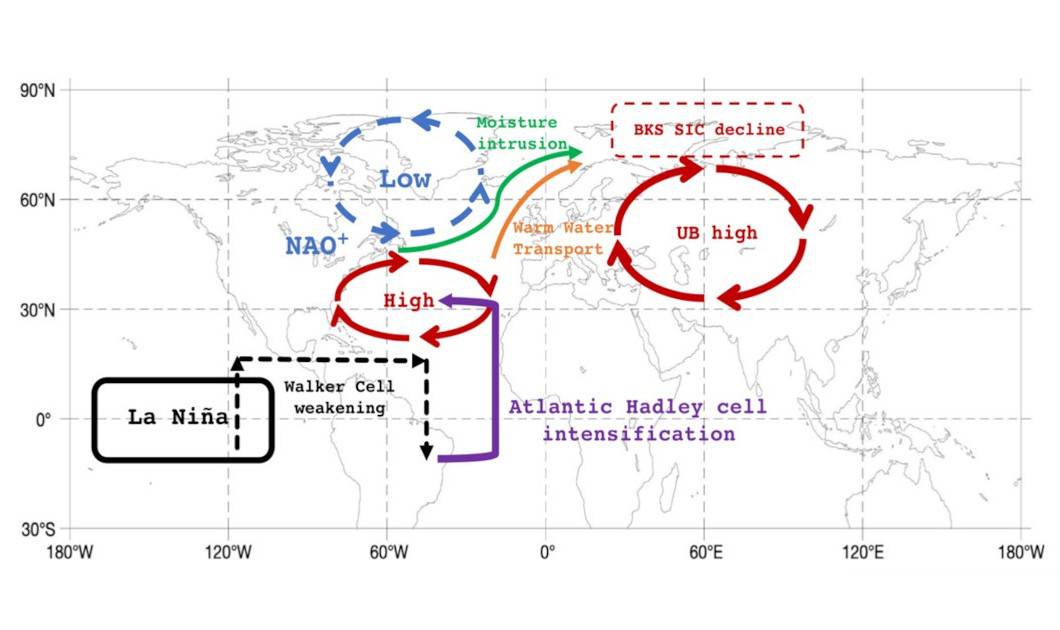 The Pacific currents influence those of the Atlantic during their extreme phases. Their effects are felt as far as the Arctic, the Barents Sea and the Kara Sea.